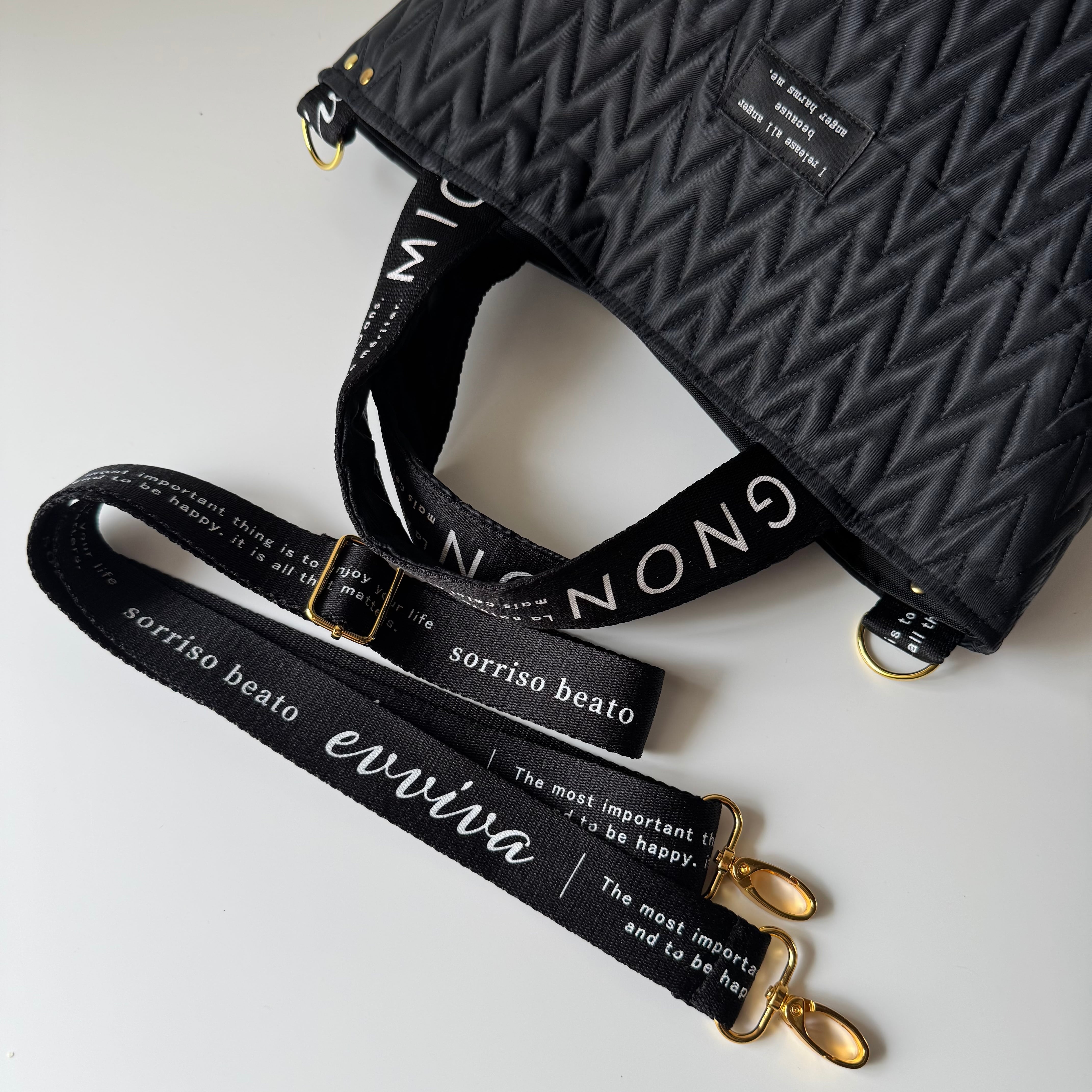 •英字ロゴストラップ:ブラックベースにホワイトの文字で、さりげなくも目を引くアクセント。