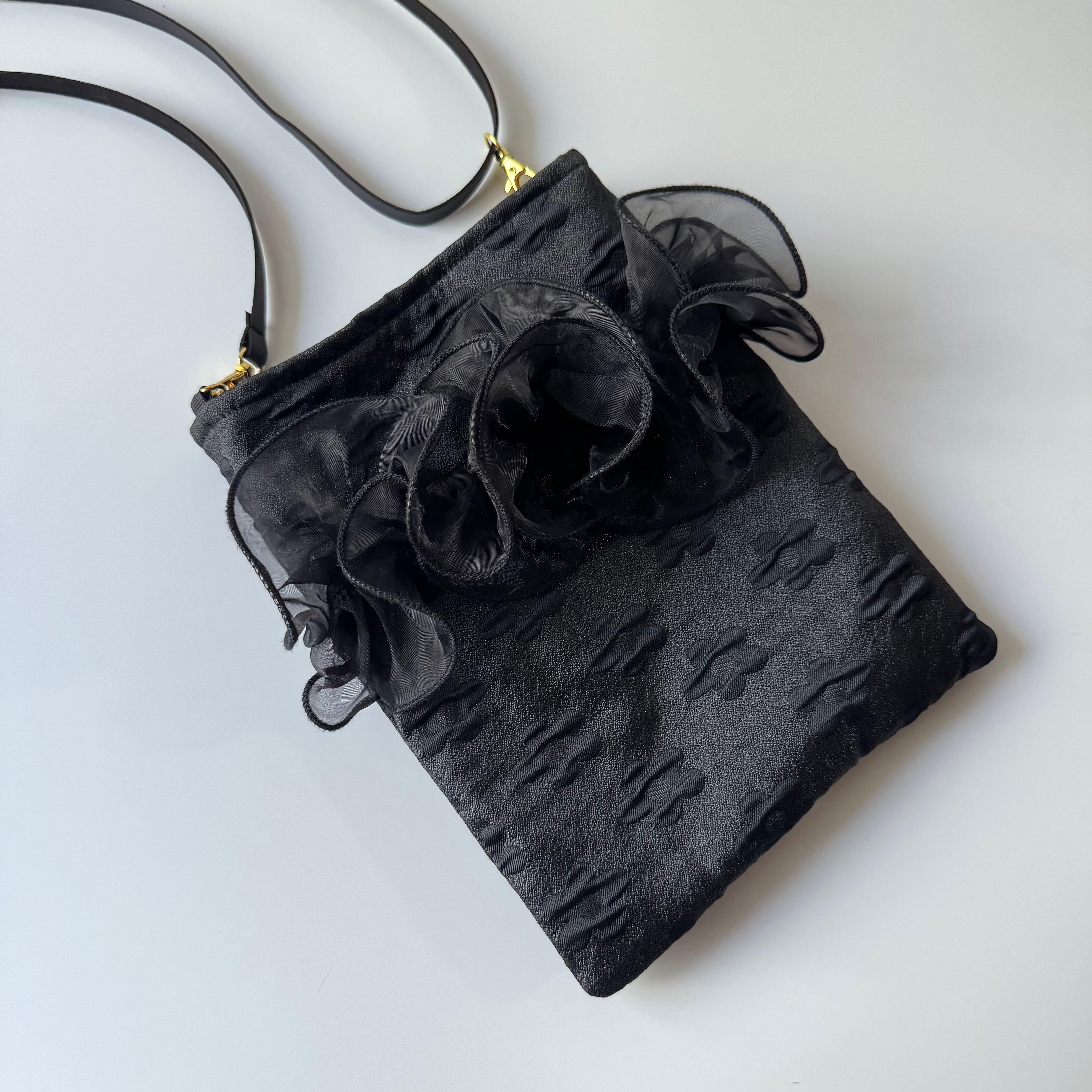 上品な光沢感のあるジャガード生地に、大きく波打つオーガンジーのフリルをあしらったスマホショルダー。